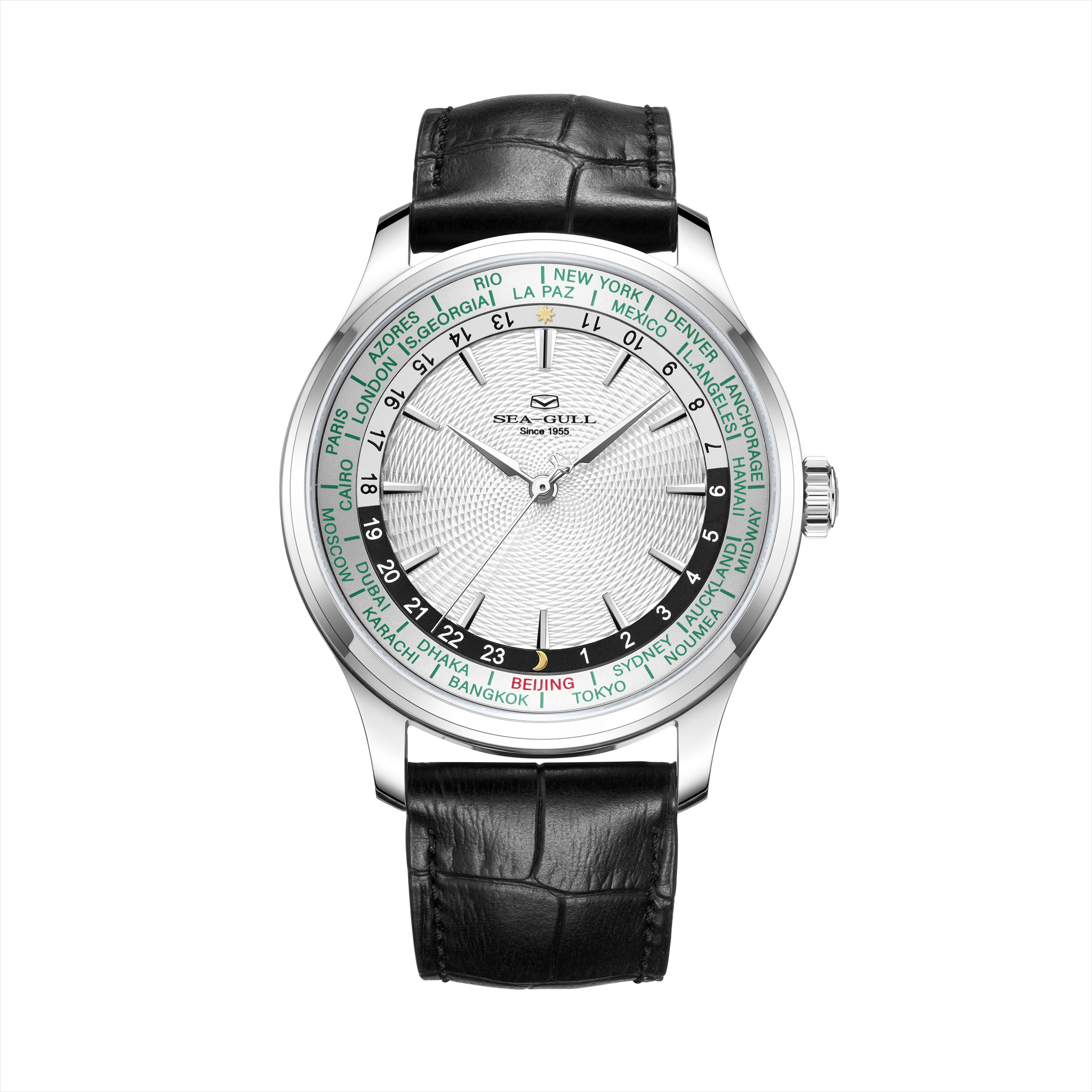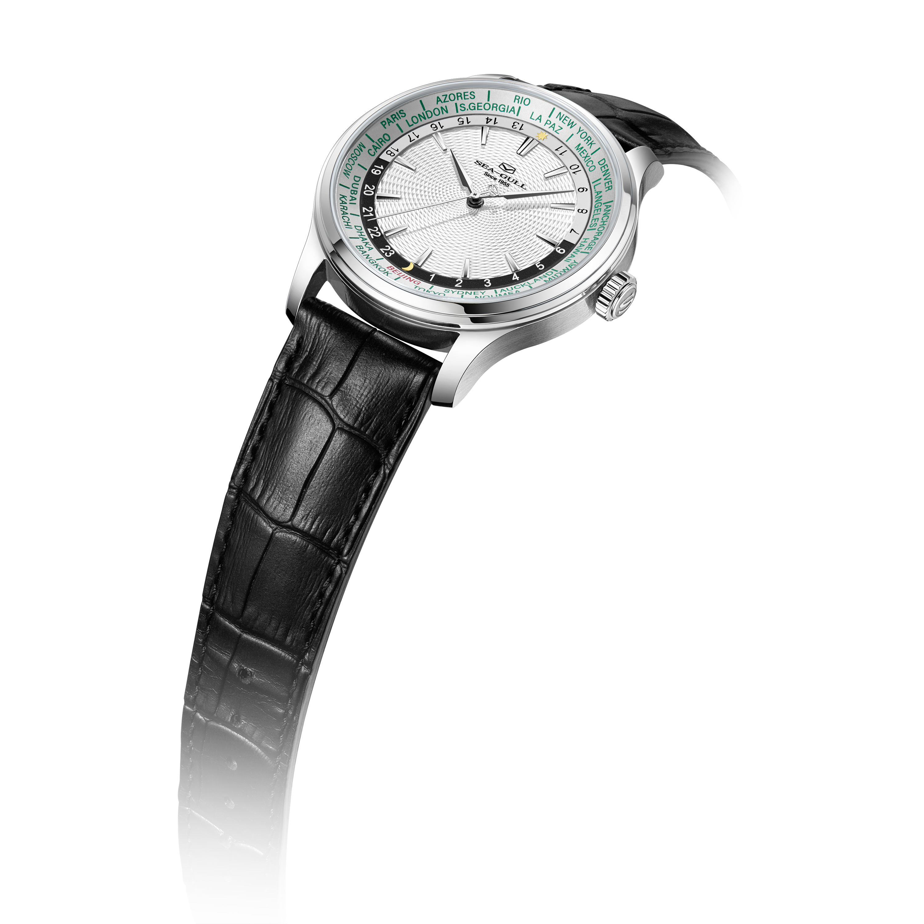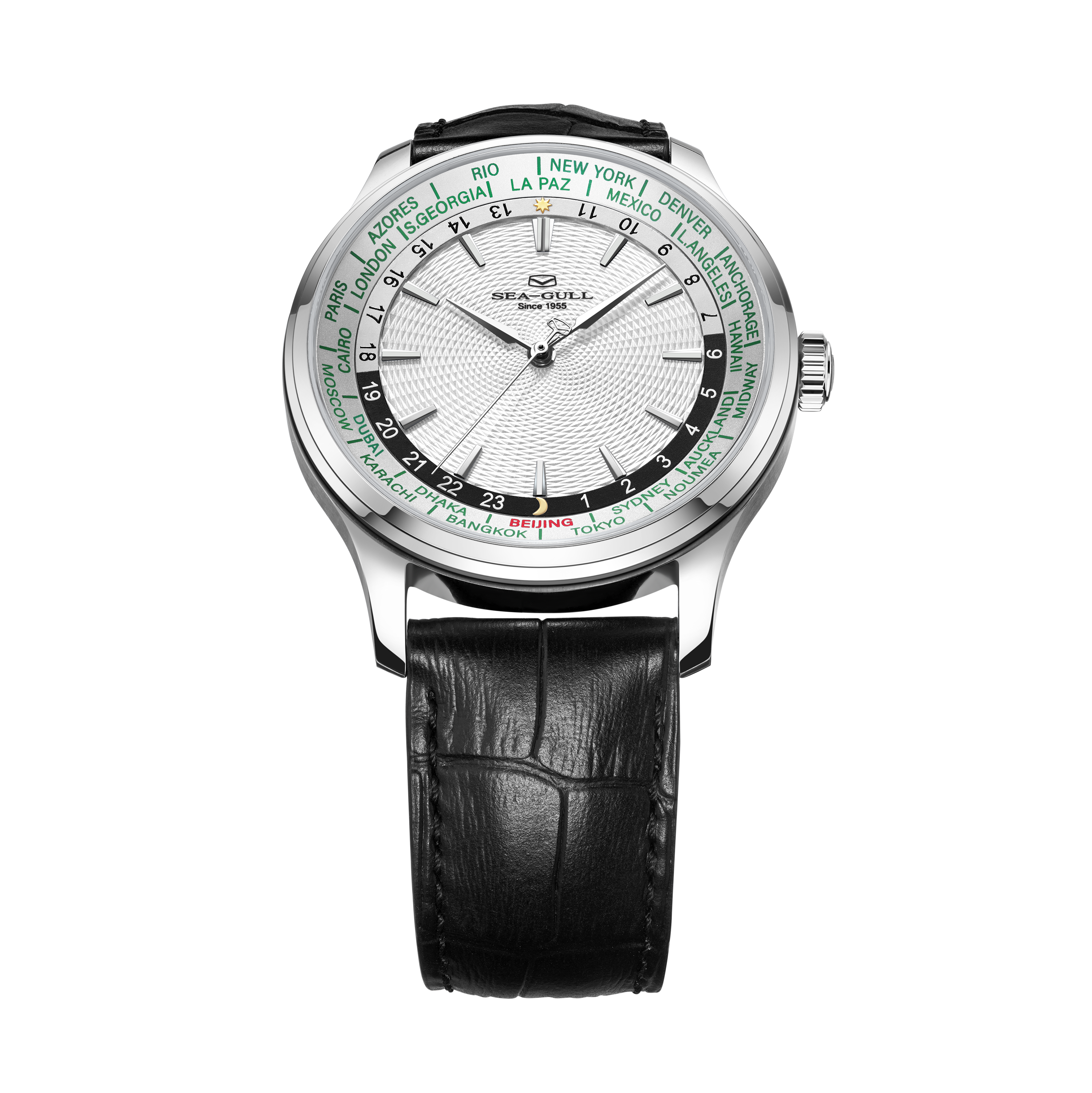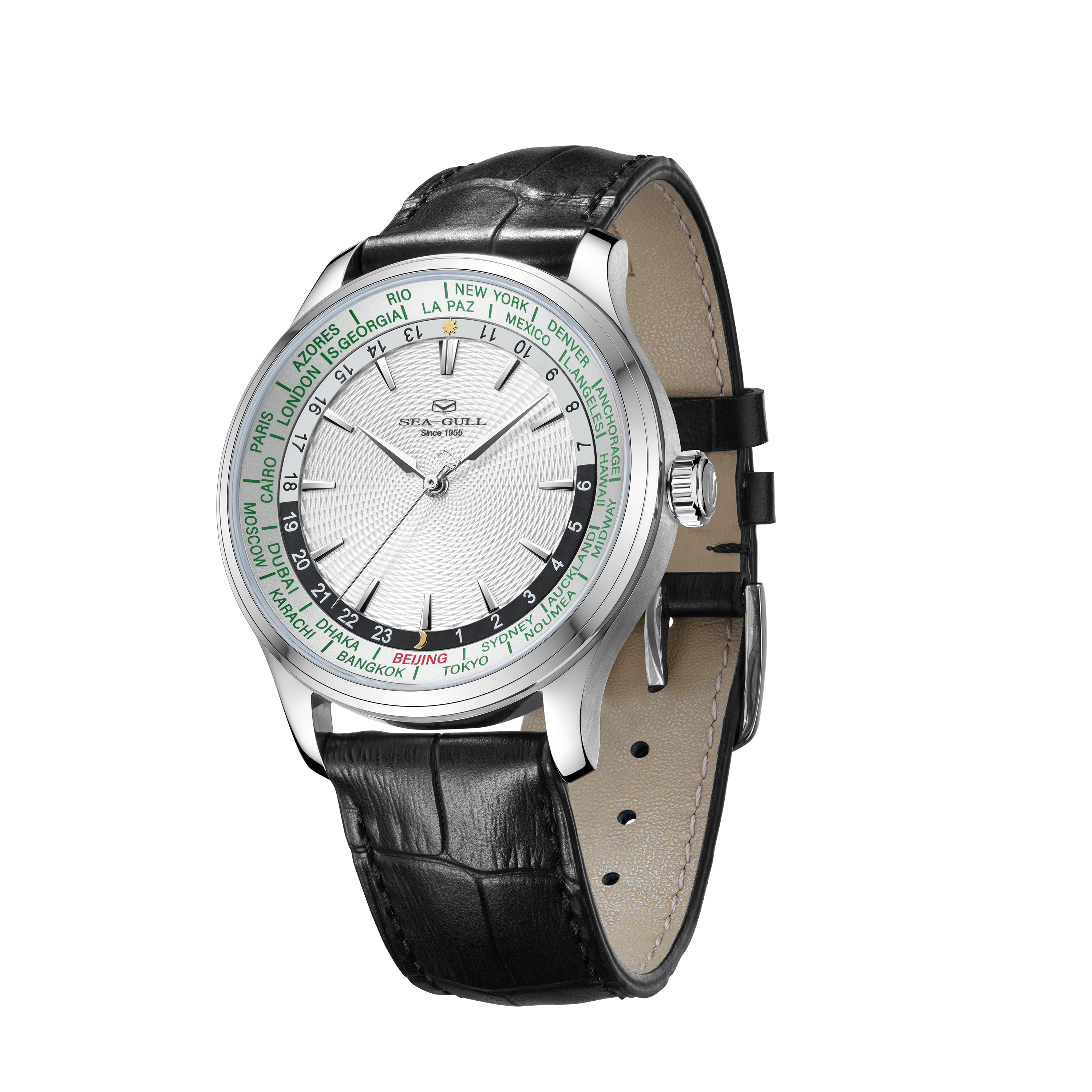 海鸥超凡系列世界时腕表,搭载海鸥首款集成世界时间功能与自动上链机械机芯,这一独特设计,为频繁跨时区出行或关注全球时间的人士量身打造。腕表配备全球 24 个时区城市标环及 24 小时显示,直观呈现各地区昼夜状态。一键调节时针到所在地时区,且快速调校系统保证切换时区时走时精度不受影响,轻松应对全球时差变化。