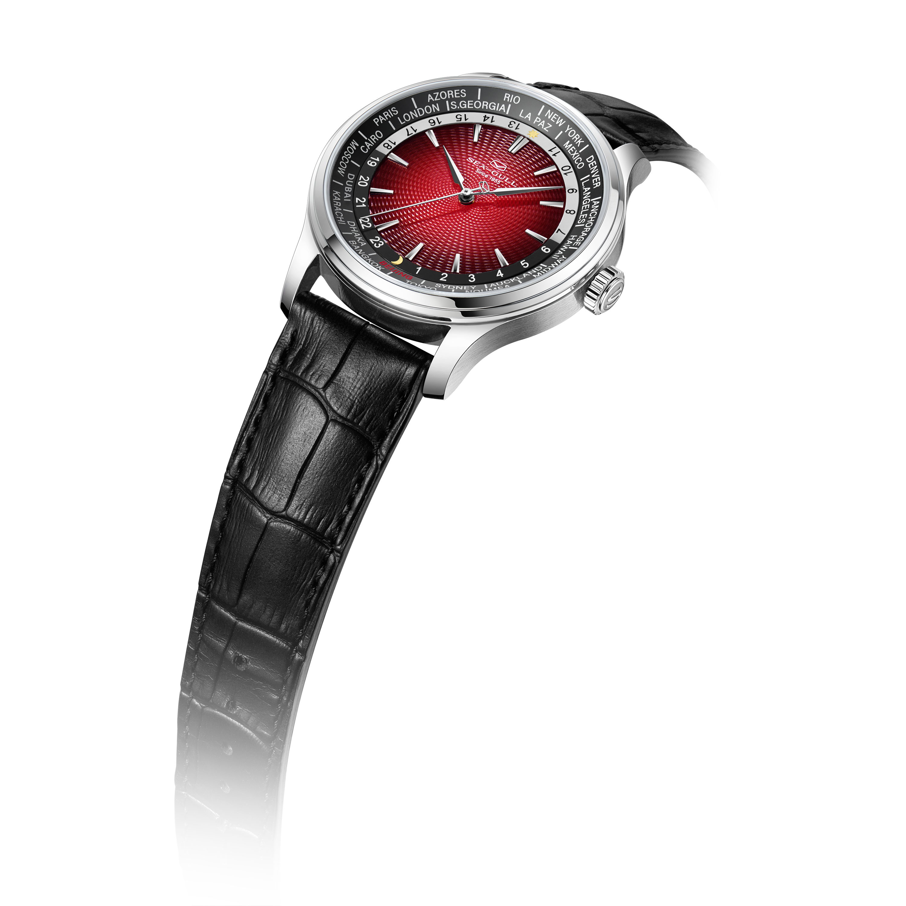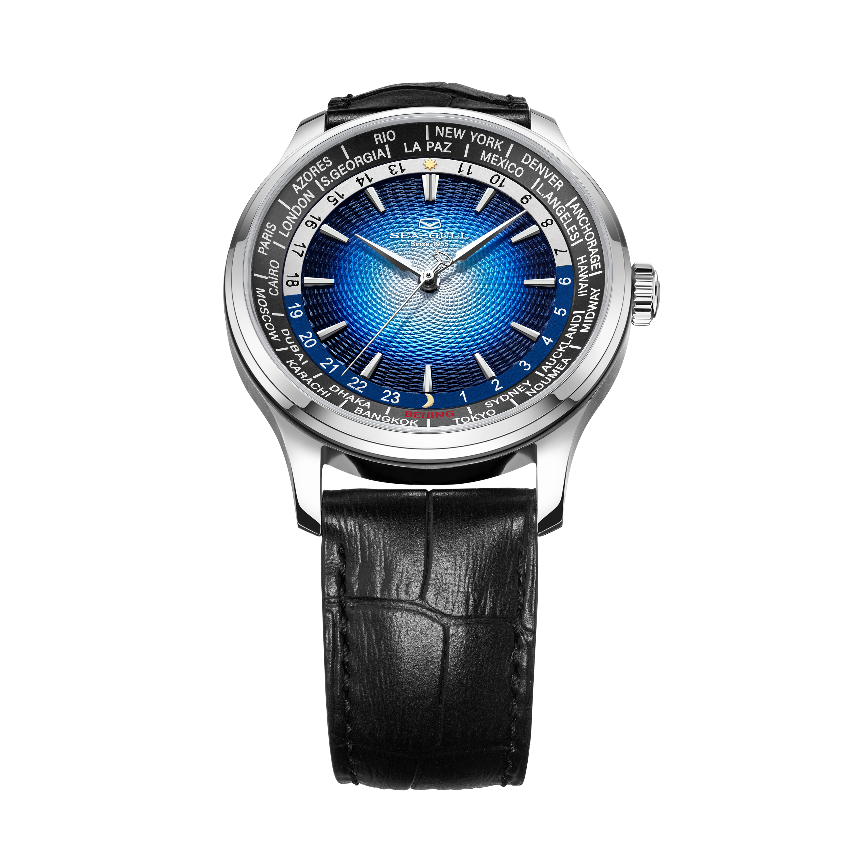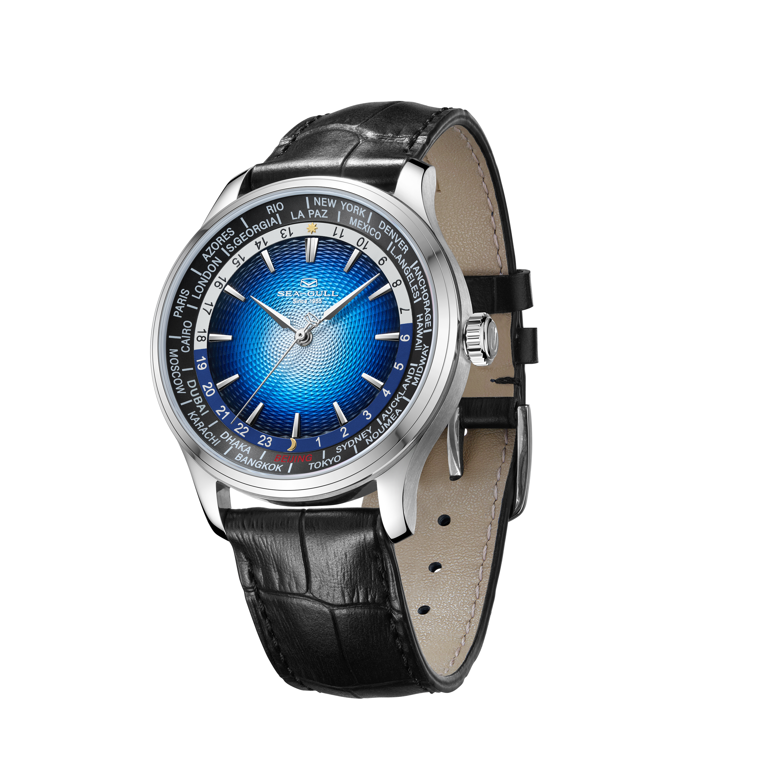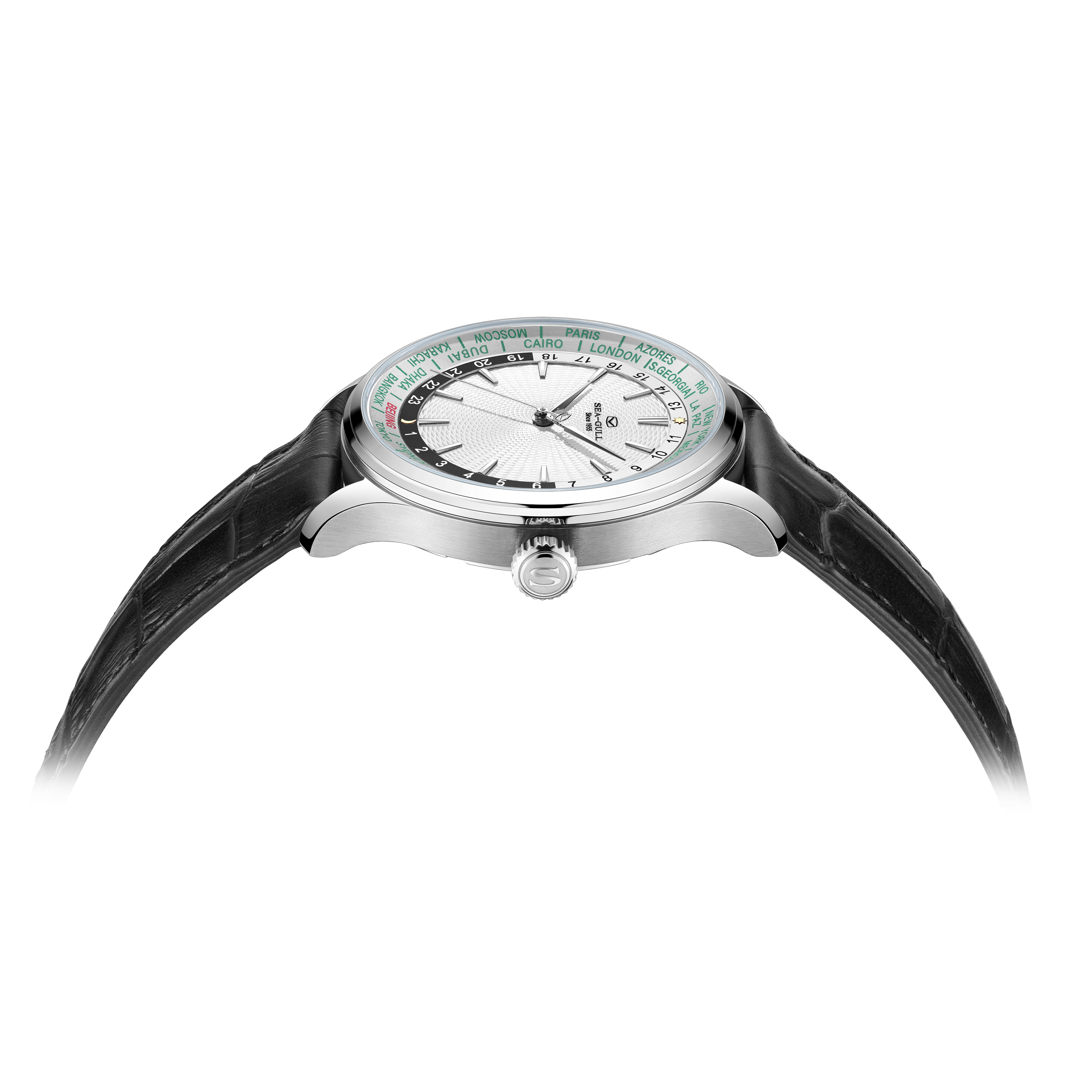 海鸥超凡系列世界时腕表,搭载海鸥首款集成世界时间功能与自动上链机械机芯,这一独特设计,为频繁跨时区出行或关注全球时间的人士量身打造。腕表配备全球 24 个时区城市标环及 24 小时显示,直观呈现各地区昼夜状态。一键调节时针到所在地时区,且快速调校系统保证切换时区时走时精度不受影响,轻松应对全球时差变化。