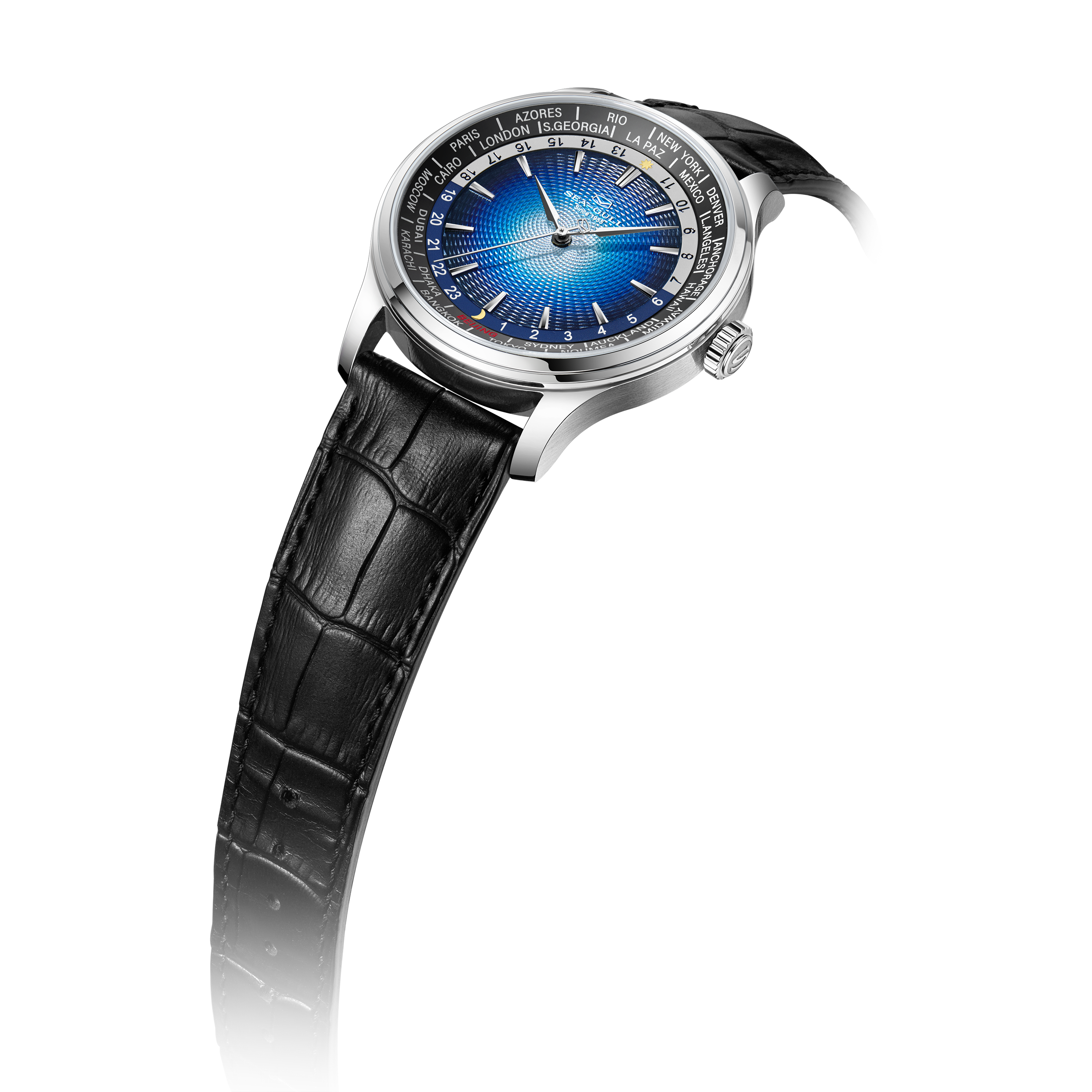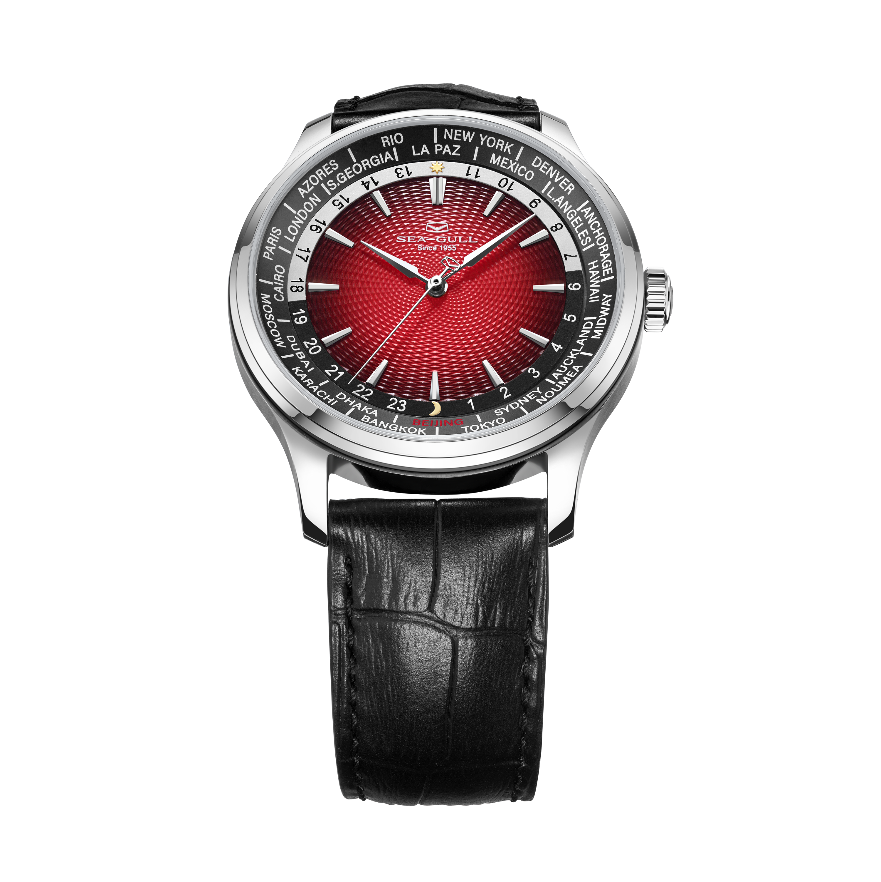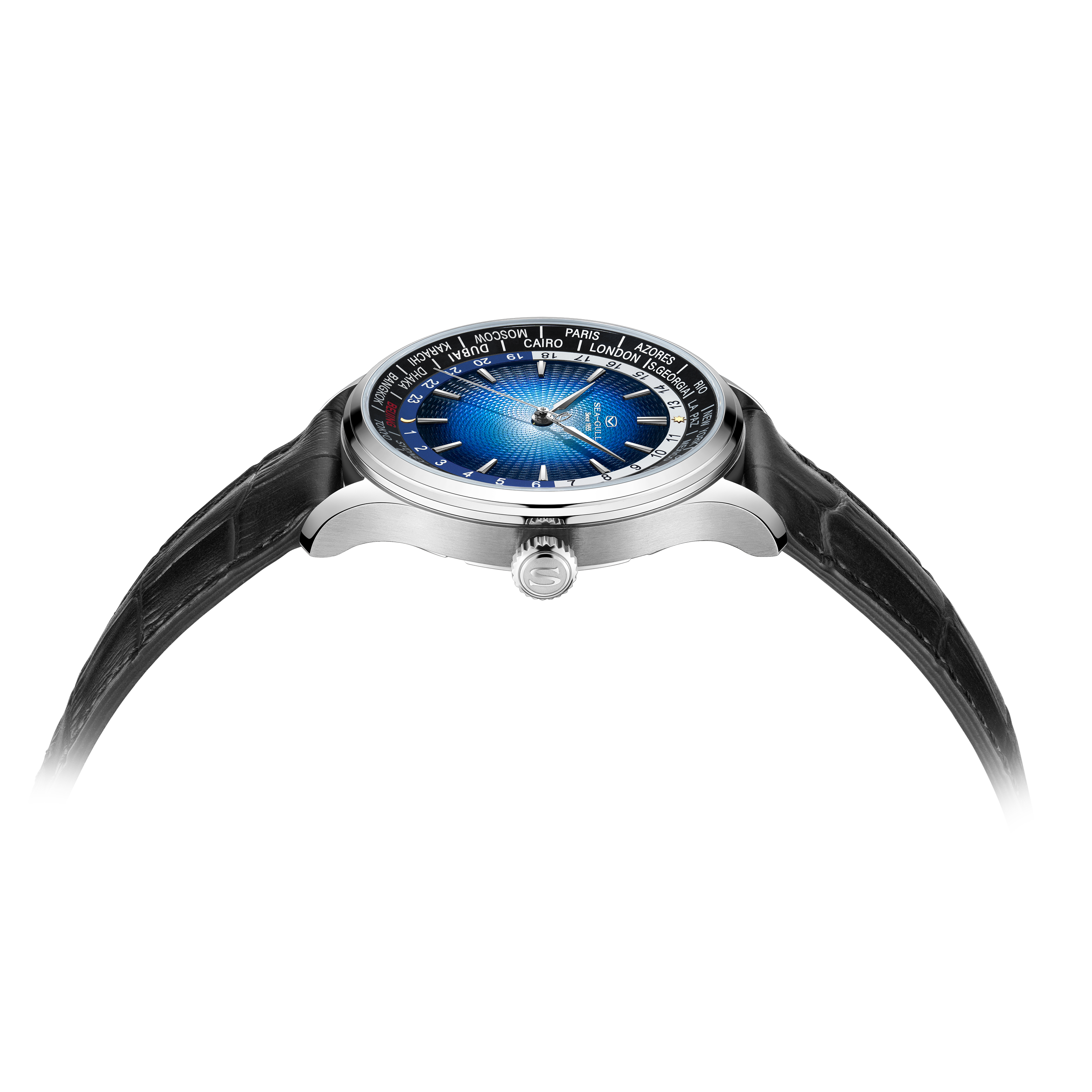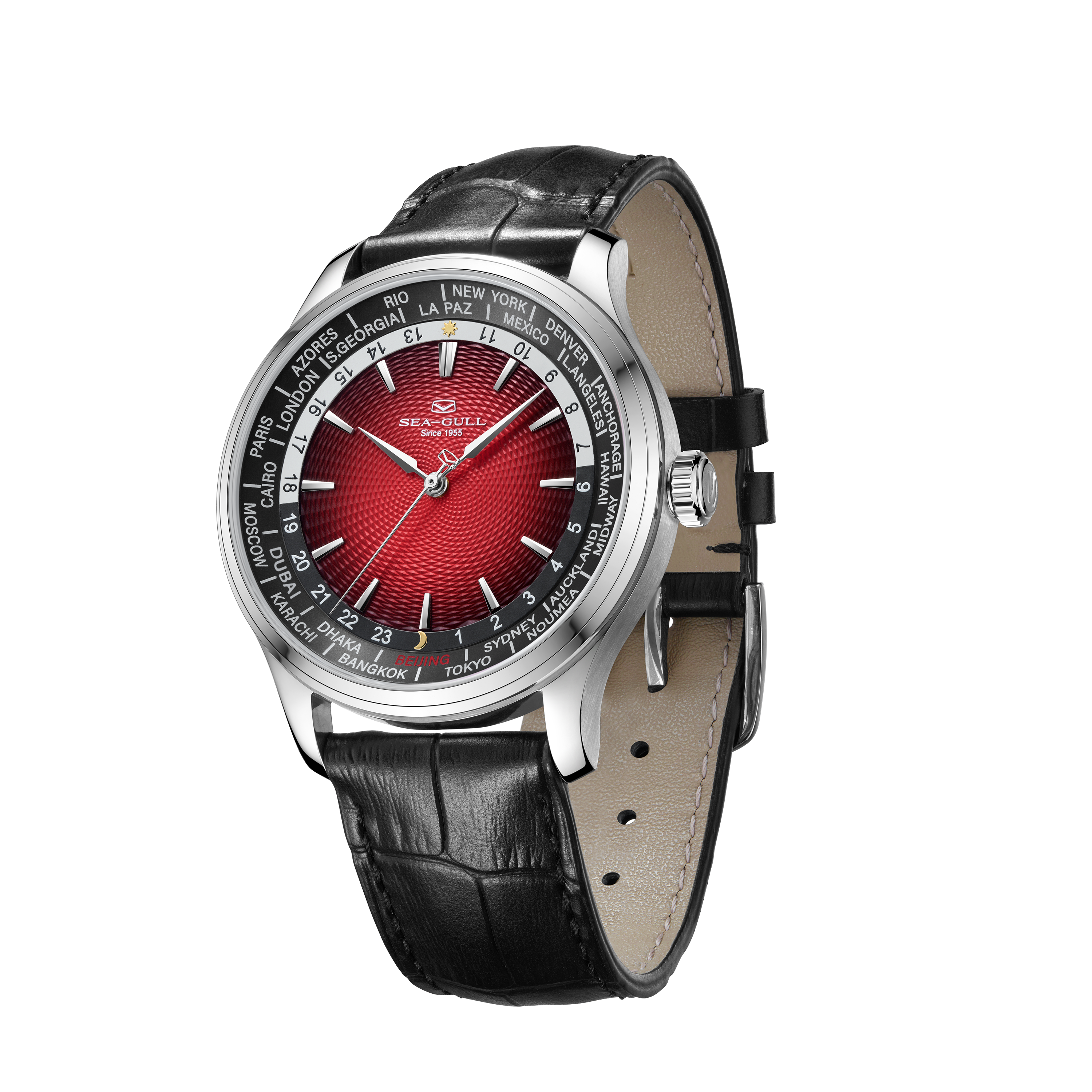 海鸥超凡系列世界时腕表,搭载海鸥首款集成世界时间功能与自动上链机械机芯,这一独特设计,为频繁跨时区出行或关注全球时间的人士量身打造。腕表配备全球 24 个时区城市标环及 24 小时显示,直观呈现各地区昼夜状态。一键调节时针到所在地时区,且快速调校系统保证切换时区时走时精度不受影响,轻松应对全球时差变化。