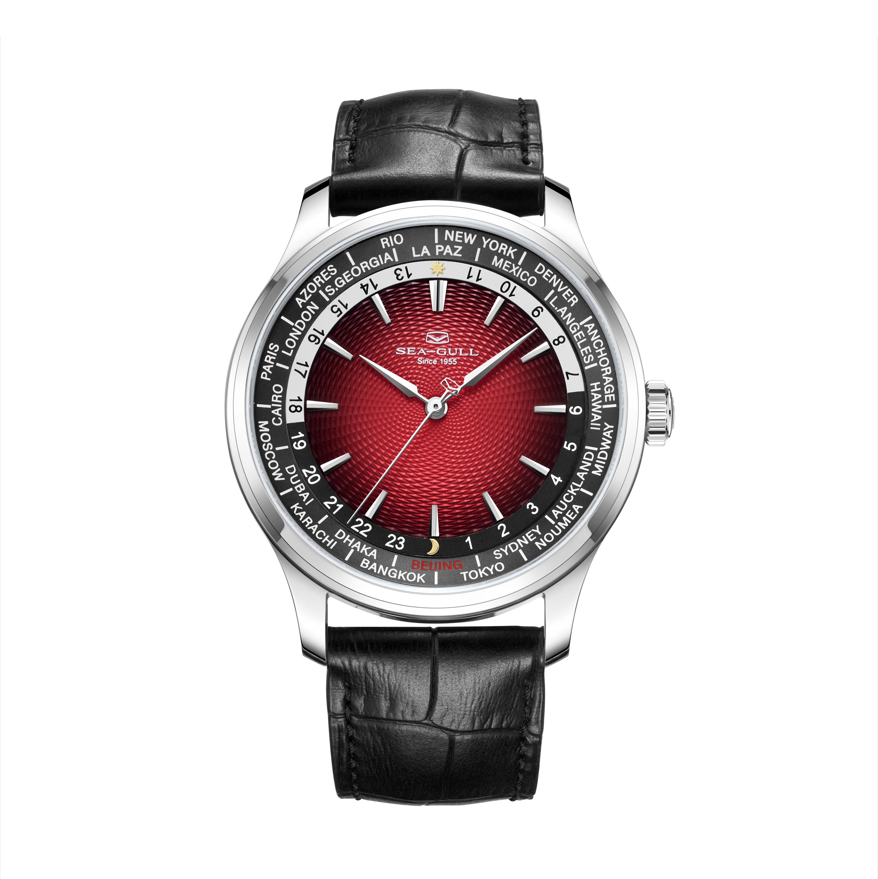 渐变红色玑镂纹盘面为基底,其上内圈标注 24 个时区城市标环,北京以醒目红色标识。24 小时显示圈黑白色区分昼夜,搭配金色月亮和太阳标识,色彩区分明确,不仅提升世界时功能可读性,更丰富盘面层次。银色柳叶刀型指针简洁利落,读时清晰快捷,与整体设计相得益彰。