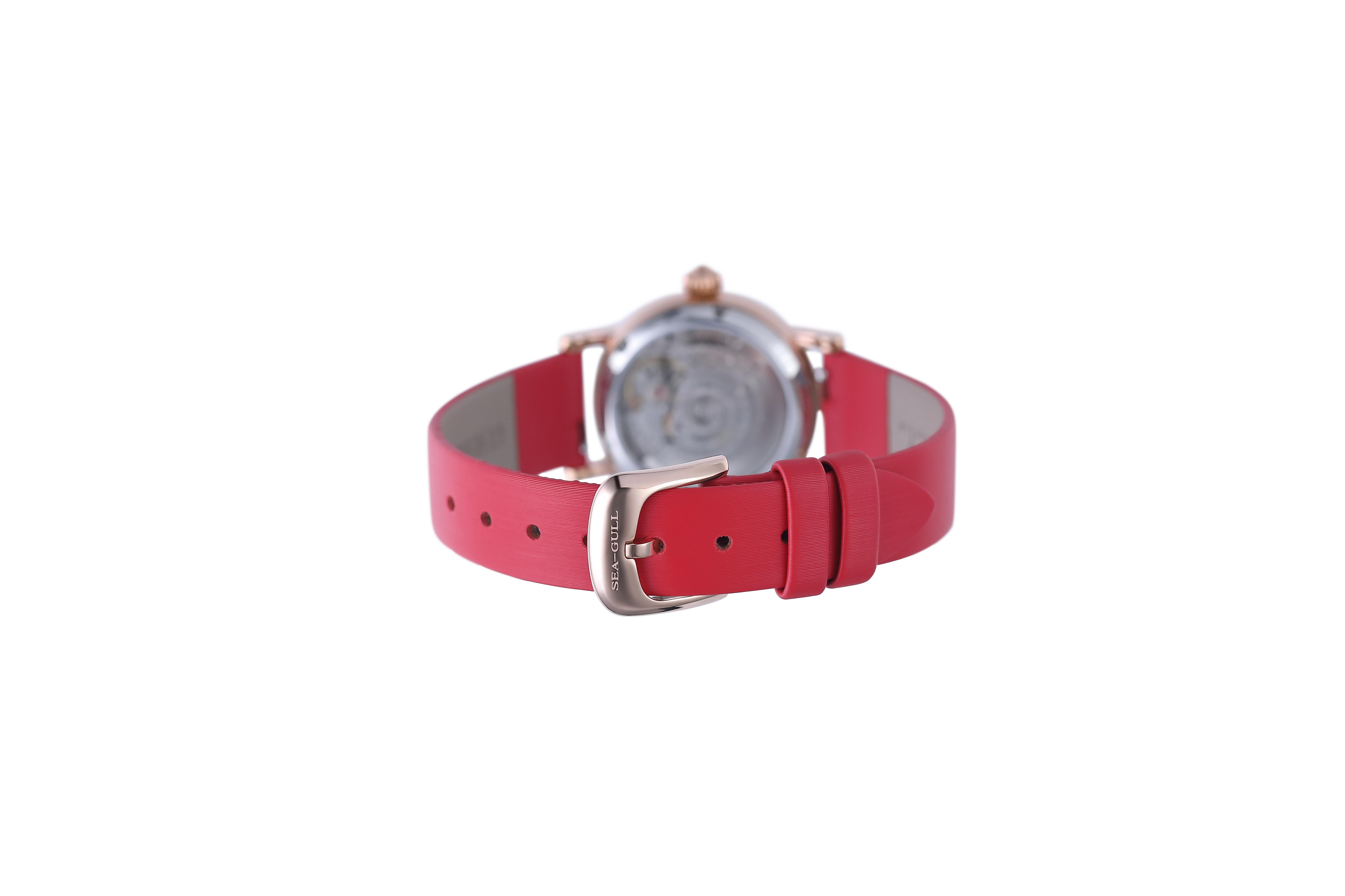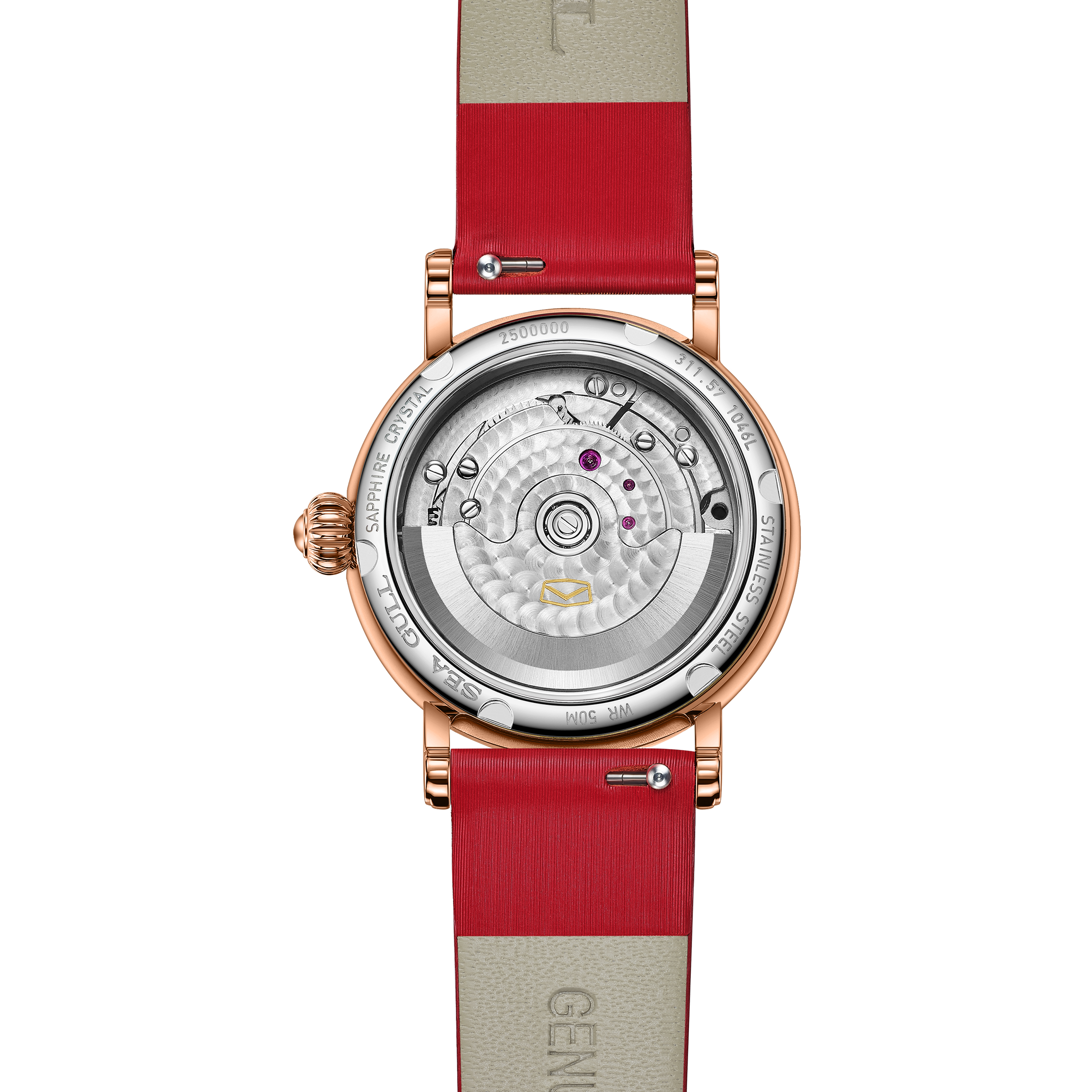 表背透底设计可见海鸥自研ST4200机芯跳动的灵动美感,这枚国表尺寸最小的机械腕表机芯,于温柔的腕表中增添一份细腻的力量。机芯精巧的“身躯”内,蕴藏着28800次/小时,稳定而澎湃的能量。 炽烈如火的红色绢带表带环于腕间,更贴合手腕曲线,是为女性量身定制的温柔陪伴,尽显精致华丽的风格。此腕表于红色方寸间呈现马年的祥瑞祝愿,在时间流转间与现代女性内在的温柔和韧性共鸣。